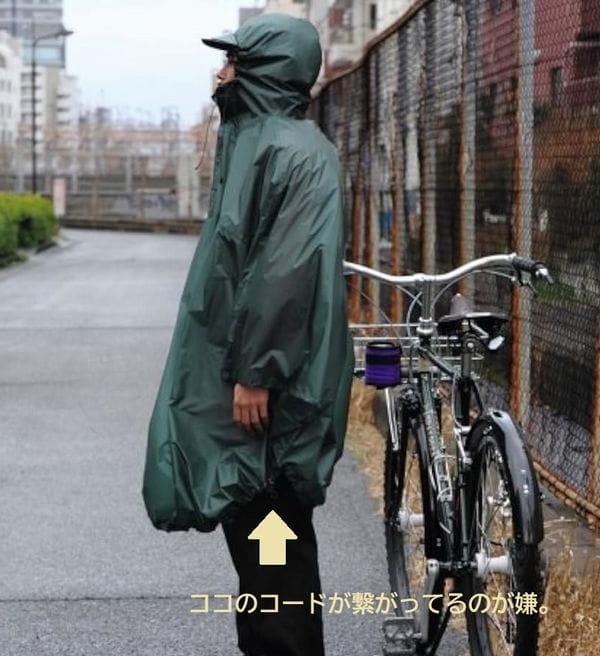あと簡易雨よけ的にポンチョの前方をハンドルに引っかけて使用した場合、絞り具合によっては後方お尻部分が前に引っ張られる形になって、自分の足などに雨だれが掛かってしまう可能性とかありそうだなと感じました。