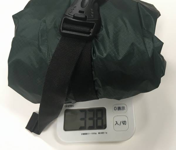 338g。メーカー公称270gで自作バックルを卵1個分くらいと考えれば、まあ許容範囲内でしょう。たかが230gとお思いでしょうが、この差はデカいです。大きさも前より圧倒的にコンパクトなので、単純にバッグ内のスペースも空きました。