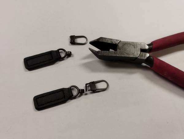 要は腰に巻ける加工がしたいだけなので、家の中に転がっている何か使えそうな物を探します。ジッパータブのようなものがあったのでリング部をパッチン。写真では分かりづらいですが、引き手の部分は革製でこのままだとちょっと長いのでハサミでチョッキン。